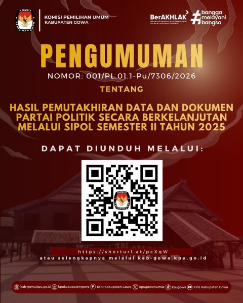 Gowa, kab-gowa.kpu.go.id - KPU Kabupaten Gowa mengumumkan hasil pemutakhiran data partai politik secara berkelanjutan melalui SIPOL Semester II Tahun 2025.
