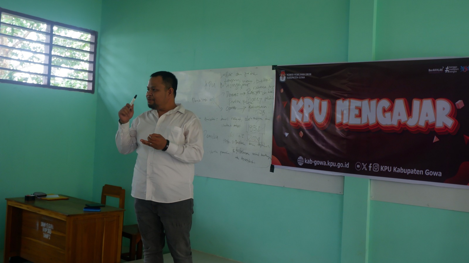 Komisioner KPU Gowa yang juga merupakan Ketua Divisi Hukum dan Pengawasan, Suwahyu, S.Si., bertindak langsung sebagai narasumber atau "Guru Sementara". Dalam pemaparannya, Suwahyu menguraikan enam poin besar, mulai dari definisi demokrasi, sejarah Pemilu di Indonesia (dimulai tahun 1955), hak dasar warga negara, hingga fungsi partai politik.