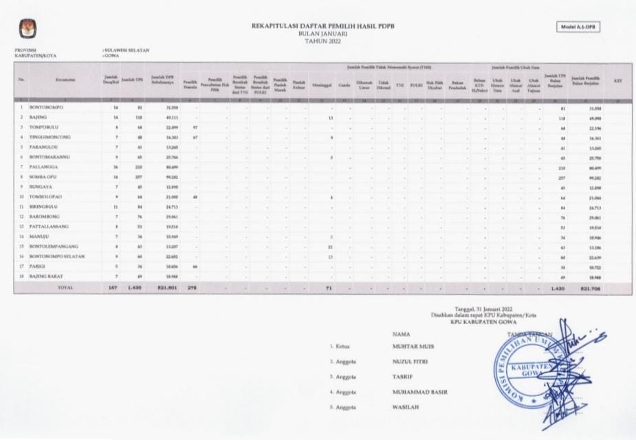 DAFTAR PERUBAHAN PEMILIH HASIL PDPB KAB. GOWA PERIODE JANUARI TAHUN 2022