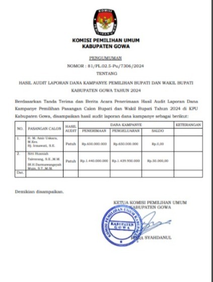 HASIL AUDIT LAPORAN DANA KAMPANYE PEMILIHAN BUPATI DAN WAKIL BUPATI KABUPATEN GOWA TAHUN 2024