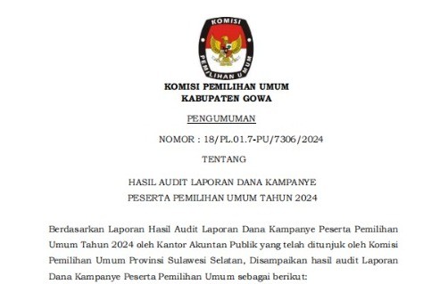 Umum Tahun 2024 oleh Kantor Akuntan Publik yang telah ditunjuk oleh Komisi Pemilihan Umum Provinsi Sulawesi Selatan, Disampaikan hasil audit Laporan Dana Kampanye Peserta Pemilihan Umum silahkan download disini