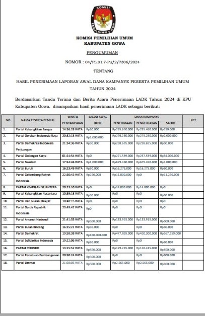 Berdasarkan Tanda Terima dan Berita Acara Penerimaan LADK Tahun 2024 di KPU Kabupaten Gowa. disampaikan hasil penerimaan LADK silahkan download disni