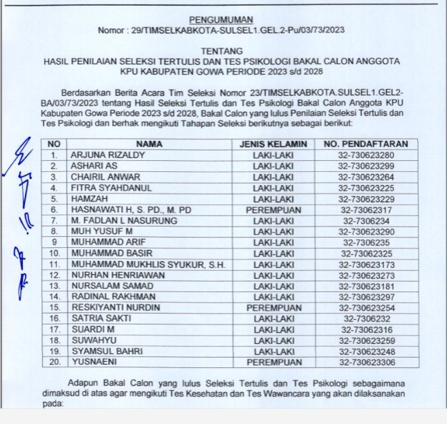 Berdasarkan Berita Acara Tim Seleksi Nomor 29/TIMSELKABKOTA.SULSEL.1.GEL2-Pu/03/73/2023 Tentang Hasil Penilian Seleksi Tertulis dan Tes Psikologi Bakal Calon Anggota KPU Kabupaten/Kota Gowa Periode 2023 sd 2028 silahkan Download disini Pengumuman KPU