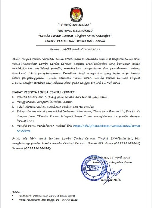 “ PENGUMUMAN “ FESTIVAL KELINGKING “Lomba Cerdas Cermat Tingkat SMA/Sederajat” KOMISI PEMILIHAN UMUM KAB. GOWA Nomor : 24/PP.06-Pu/7306/2023 Dalam rangka Pemilu Serentak Tahun 2024, Komisi Pemilihan Umum Kabupaten Gowa akan menyelenggarakan Lomba Cerdas Cermat Tingkat SMA/Sederajat yang bertujuan untuk meninkgkatkan partisipasi pemilih, memberikan pengetahuan dan pemahaman tentang demokrasi, teknis penyelenggaraan Pemilihan, bagi masyarakat yang ingin berpartisipasi dalam penyelenggaraan Pemilu Serentak Tahun 2024. Lomba Cerdas Cermat Tingkat SMA/Sederajat tersebut akan dilaksanakan pada tanggal 09 s/d 12 Mei 2023.