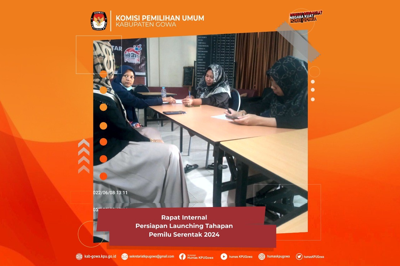 #temanpemilih, POREIGOWA, Launching tahapan Pemilu 2024 yang jatuh pada hari Selasa, 14 Juni 2022, KPU Gowa mengadakan rapat internal membahas persiapan kegiatan tersebut. Rapat ini dipimpin Kordinator Divisi Sosialisasi, Pendidikan Pemilih, Partisipasi Masyarakat dan Sumber Daya Manusia, Nuzul Fitri, dihadiri oleh Kasubag Teknis Penyelenggaraan Pemilu, Partisipasi dan Hubungan Masyarakat, Eka Hermawati dan Staf Teknis, Touvani Majid dan Nirwana bertempat di Aula Kantor KPU Gowa, Rabu 8/6/2022.