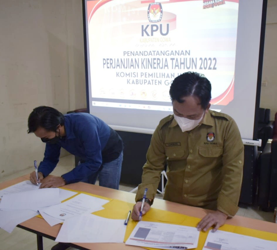 POREIGOWA --Mengawali perjalanan tahun 2022, Komisi Pemilihan Umum (KPU) Kabupaten Gowa melaksanakan penandatanganan Perjanjian Kinerja yang dilakukan Ketua KPU Gowa Muhtar Muis dan Sekretaris KPU Gowa Lukman.