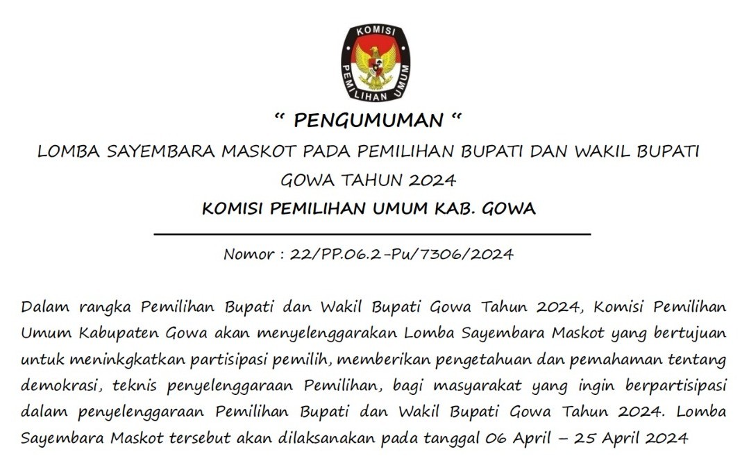 PENGUMUMAN LOMBA SAYEMBARA MASKOT PADA PEMILIHAN BUPATI DAN WAKIL BUPATI GOWA TAHUN 2024 KOMISI PEMILIHAN UMUM KAB. GOWA Nomor : 22/PP.06.2-Pu/7306/2024 .