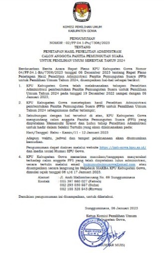 Berdasarkan Berita Acara Rapat Pleno KPU Kabupaten Gowa Nomor 04/PP.04.1-BA/7306/2023 tanggal 05 Desember 2023 tentang Rapat Pleno Penetapan Hasil Penelitian Administrasi Panitia Pemungutan Suara (PPS) untuk Pemilihan Umum Tahun 2024, disampaikan hal-hal Silahkan download disini HASIL-ADMINISTRASI-PPS