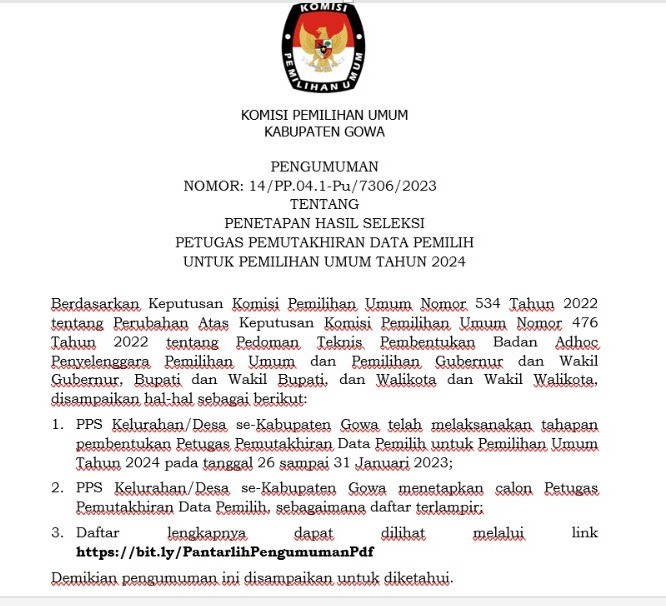 PENGUMUMAN NOMOR: 14/PP.04.1-Pu/7306/2023 TENTANG PENETAPAN HASIL SELEKSI PETUGAS PEMUTAKHIRAN DATA PEMILIH UNTUK PEMILIHAN UMUM TAHUN 2024, SILAHKAN DOWNLOAD DI LINK BERIKUT ATAU KLIK KECAMATAN