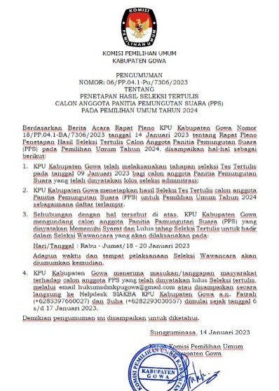 Berdasarkan Berita Acara Rapat Pleno KPU Kabupaten Gowa Nomor 18/PP.04.1-BA/7306/2023 tanggal 14 Januari 2023 tentang Rapat Pleno Penetapan Hasil Seleksi Tertulis Calon Anggota Panitia Pemungutan Suara (PPS) pada Pemilihan Umum Tahun 2024, disampaikan hal-hal Silahkan di download disini HASIL-TERTULIS-CALON-PPS