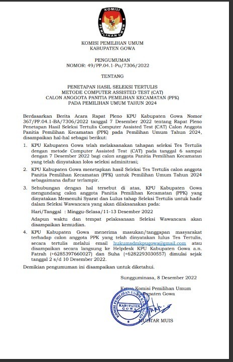 Berdasarkan Berita Acara Rapat Pleno KPU Kabupaten Gowa Nomor 367/PP.04.1-BA/7306/2022 tanggal 7 Desember 2022 tentang Rapat Pleno Penetapan Hasil Seleksi Tertulis Computer Assisted Test (CAT) Calon Anggota Panitia Pemilihan Kecamatan (PPK) pada Pemilihan Umum Tahun 2024 , disampaikan hal-hal sebagai berikut: