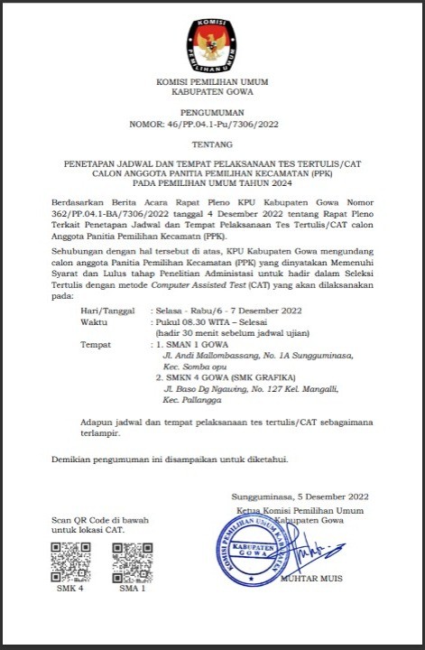 Berdasarkan Berita Acara Rapat Pleno KPU Kabupaten Gowa Nomor 362/PP.04.1-BA/7306/2022 tanggal 4 Desember 2022 tentang Rapat Pleno Terkait Penetapan Jadwal dan Tempat Pelaksanaan Tes Tertulis/CAT calon Anggota Panitia Pemilihan Kecamatn (PPK).