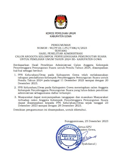 PENGUMUMAN HASIL PENELITIAN ADMINISTRASI CALON ANGGOTA KELOMPOK PENYELENGGARA PEMUNGUTAN SUARA UNTUK PEMILIHAN UMUM TAHUN 2024 SE- KABUPATEN GOWA