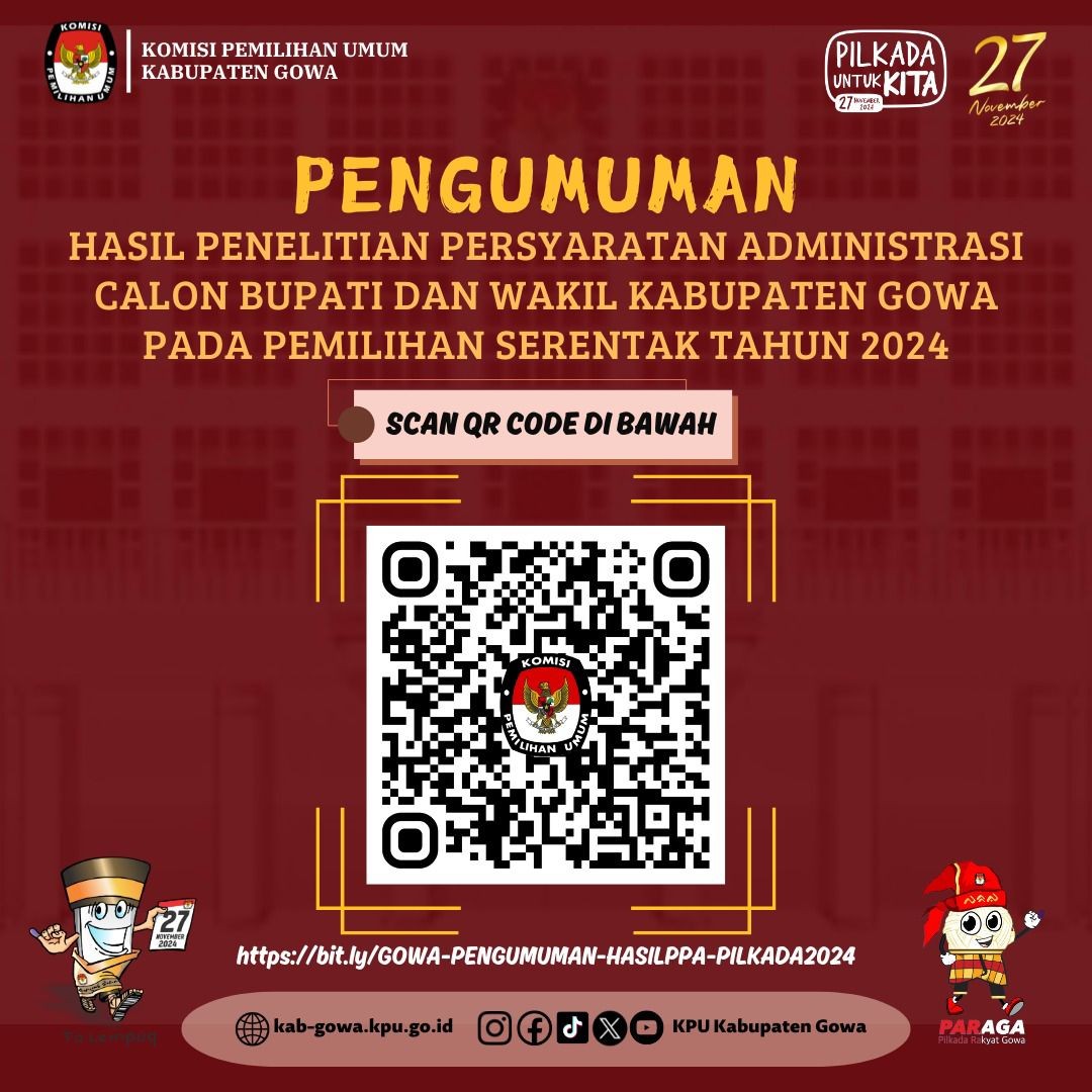 PENGUMUMAN HASIL PENELITIAN PERSYARATAN ADMINISTRASI CALON BUPATI DAN WAKIL BUPATI GOWA PADA PEMILIHAN SERENTAK TAHUN 2024 SILAHKAN DOWNLOAD DI SINI