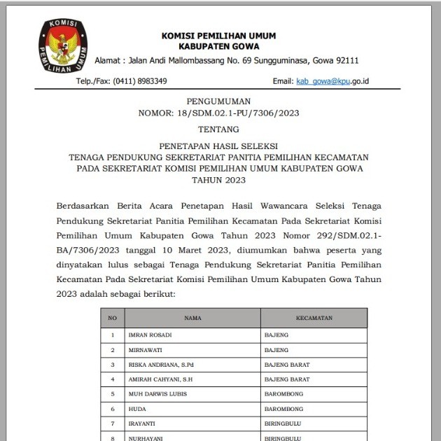 Pengumuman nomor: 18/sdm.02.1-pu/7306/2023 tentang penetapan hasil seleksi tenaga pendukung sekretariat panitia pemilihan kecamatan pada sekretariat komisi pemilihan umum kabupaten gowa tahun 2023.