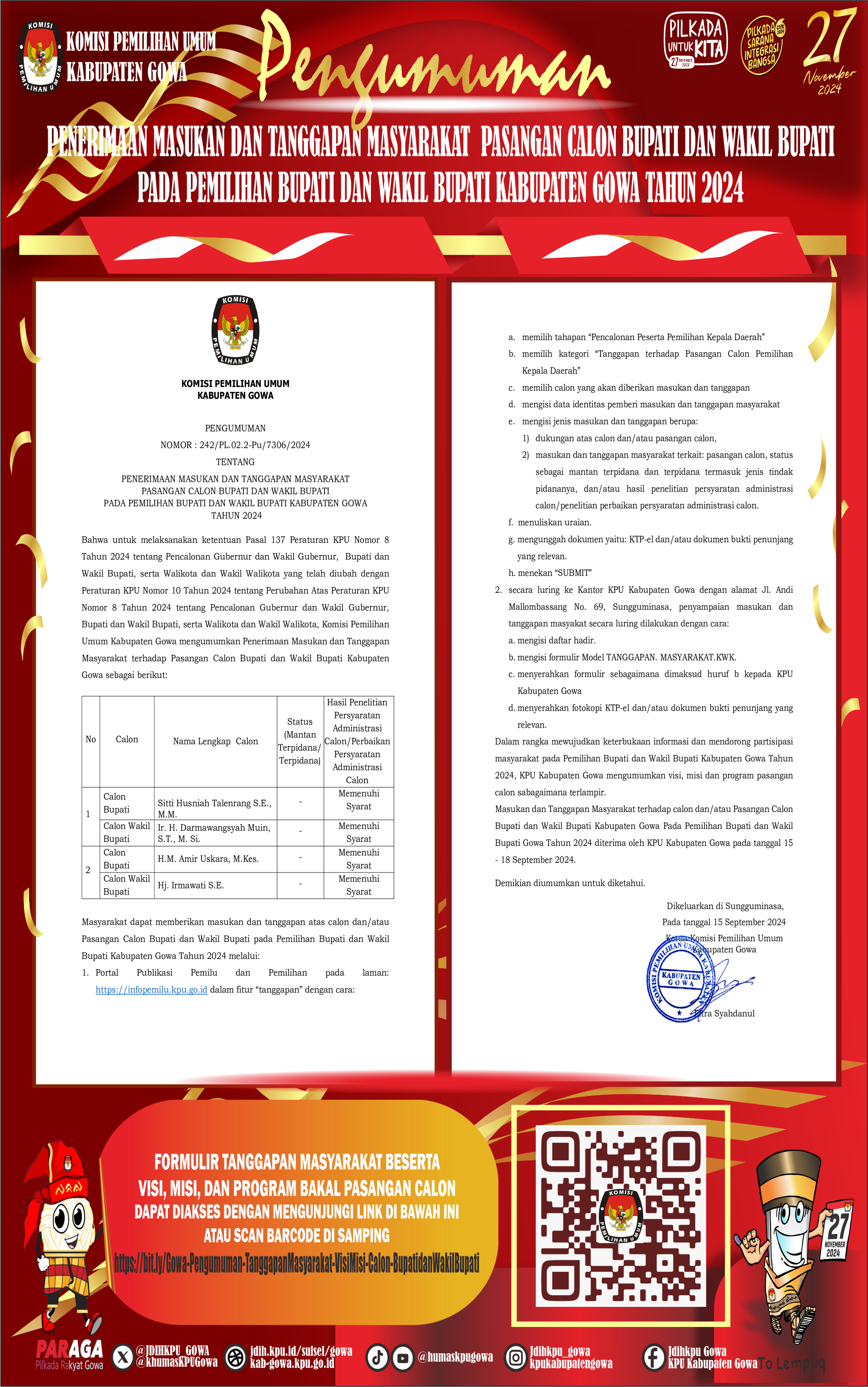 PENGUMUMAN PENERIMAAN DAN TANGGAPAN MASYARAKAT PASLON BUPATI DAN WAKIL BUPATI GOWA