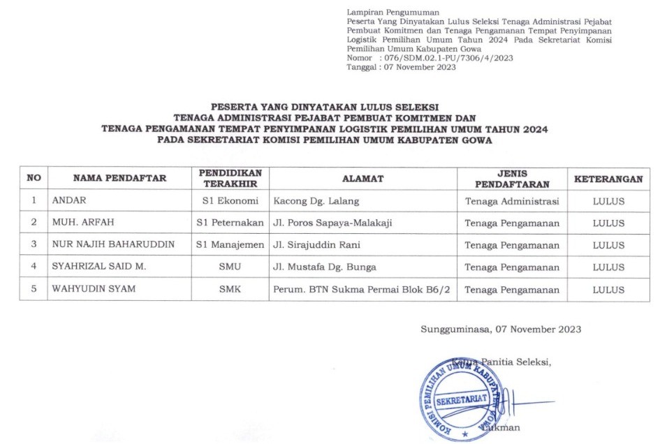 Bersama dengan ini disampaikan peserta yang dinyatakan Lulus Seleksi Tenaga Administrasi Pejabat Pembuat Komitmen dan Tenaga Pengamanan Tempat Penyimpanan Logistik Pemilihan Umum Tahun 2024 pada Sekretariat Komisi Pemilihan Umum Kabupaten Gowa, sebagaimana terlampir pada Pengumuman ini. Keputusan Panitia Seleksi bersifat mutlak dan tidak dapat diganggu gugat.