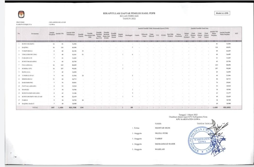 Berdasarkan ketentuan Peraturan Komisi Pemilihan Umum Nomor 6 Tahun 2021 perihal Pemutakhiran Data Pemilih Berkelanjutan Tahun 2021, hasil rapat Rekapitulasi yang dilakukan oleh KPU Kabupaten Gowa menghasilkan hal sebagai berikut: