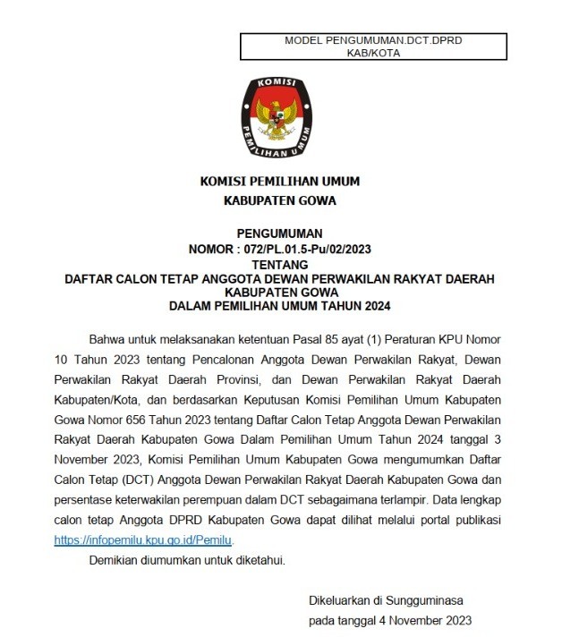 Bahwa untuk melaksanakan ketentuan Pasal 85 ayat (1) Peraturan KPU Nomor 10 Tahun 2023 tentang Pencalonan Anggota Dewan Perwakilan Rakyat, Dewan Perwakilan Rakyat Daerah Provinsi, dan Dewan Perwakilan Rakyat Daerah Kabupaten/Kota, dan berdasarkan Keputusan Komisi Pemilihan Umum Kabupaten Gowa Nomor 656 Tahun 2023 tentang Daftar Calon Tetap Anggota Dewan Perwakilan Rakyat Daerah Kabupaten Gowa Dalam Pemilihan Umum Tahun 2024 tanggal 3 November 2023, Komisi Pemilihan Umum Kabupaten Gowa mengumumkan Daftar Calon Tetap (DCT) Anggota Dewan Perwakilan Rakyat Daerah Kabupaten Gowa dan persentase keterwakilan perempuan dalam DCT sebagaimana terlampir. Data lengkap calon tetap Anggota DPRD Kabupaten Gowa dapat dilihat melalui portal publikasi https://infopemilu.kpu.go.id/Pemilu.