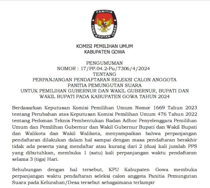 PENGUMUMAN NOMOR : 17/PP.04.2-Pu/7306/4/2024 TENTANG PERPANJANGAN PENDAFTARAN SELEKSI CALON ANGGOTA PANITIA PEMUNGUTAN SUARA UNTUK PEMILIHAN GUBERNUR DAN WAKIL GUBERNUR, BUPATI DAN WAKIL BUPATI PADA KABUPATEN GOWA TAHUN 2024 SILAHKAN DOWNLOAD DISINI