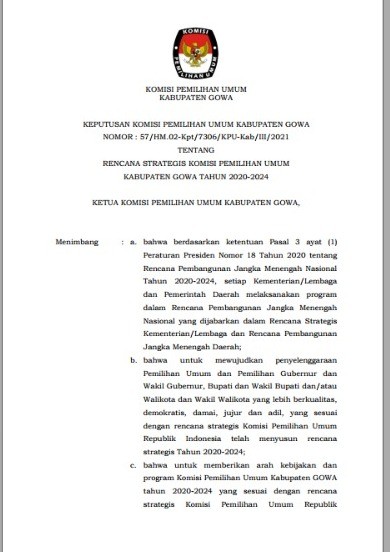 KEPUTUSAN KOMISI PEMILIHAN UMUM KABUPATEN GOWA NOMOR :57/HM.02-Kpt/7306/KPU-Kab/III/2021 TENTANG RENCANA STRATEGIS KOMISI PEMILIHAN UMUM KABUPATEN GOWA TAHUN 2020-2024