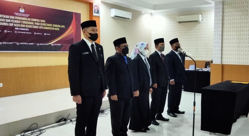 Usai Sekretaris Jenderal KPU RI Bernad Dermawan Sutrisno melantik 190 pejabat administrasi dan pejabat fungsional pada Sekretariat Jenderal KPU, Sekretariat KPU Provinsi/KIP Aceh dan Sekretariat KPU Kabupaten/kota, Ketua KPU RI Ilham Saputra berkesempatan menyampaikan amanat.