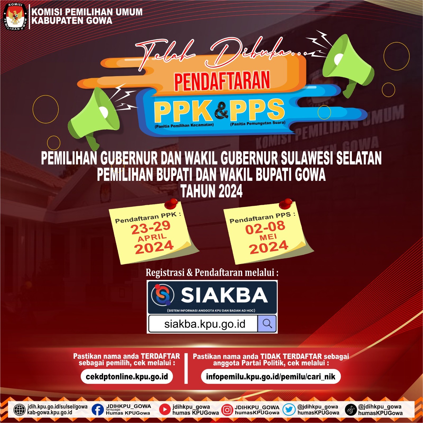 Dalam rangka pembentukan Calon Anggota Panitia Pemilihan Kecamatan untuk Pemilihan Gubernur dan Wakil Gubernur, Bupati dan Wakil Bupati Tahun 2024, Komisi Pemilihan Umum Kabupaten Gowa mengundang Warga Negara Indonesia yang memenuhi kualifikasi untuk mendaftarkan diri menjadi Panitia Pemilihan Kecamatan untuk Pemilihan Gubernur dan Wakil Gubernur, Bupati dan Wakil Bupati dengan ketentuan bisa di download disini
