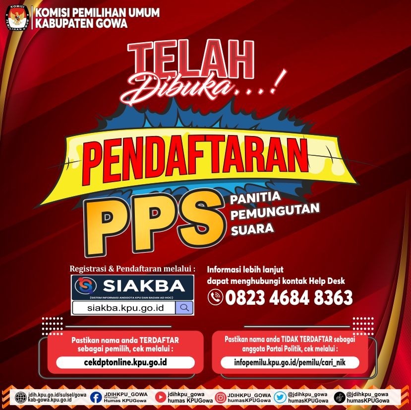 Dalam rangka pembentukan Calon Anggota Panitia Pemungutan Suara untuk Pemilihan Gubernur dan Wakil Gubernur, Bupati dan Wakil Bupati, Tahun 2024, Komisi Pemilihan Umum Kabupaten Gowa mengundang Warga Negara Indonesia yang memenuhi kualifikasi untuk mendaftarkan diri menjadi Panitia Pemungutan Suara untuk Pemilihan Gubernur dan Wakil Gubernur, Bupati dan Wakil Bupati dengan ketentuan bisa di download disini