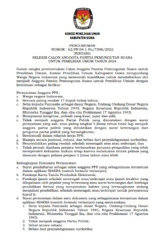 Dalam rangka pembentukan Calon Anggota Panitia Pemungutan Suara untuk Pemilihan Umum, Komisi Pemilihan Umum Kabupaten Gowa mengundang Warga Negara Indonesia yang memenuhi kualifikasi untuk mendaftarkan diri menjadi Anggota Panitia Pemungutan Suara untuk Pemilihan Umum dengan ketentuan sebagai berikut: Klik link berikut untuk download pengumuman bit.ly/SELEKSI-CALON-PPS
